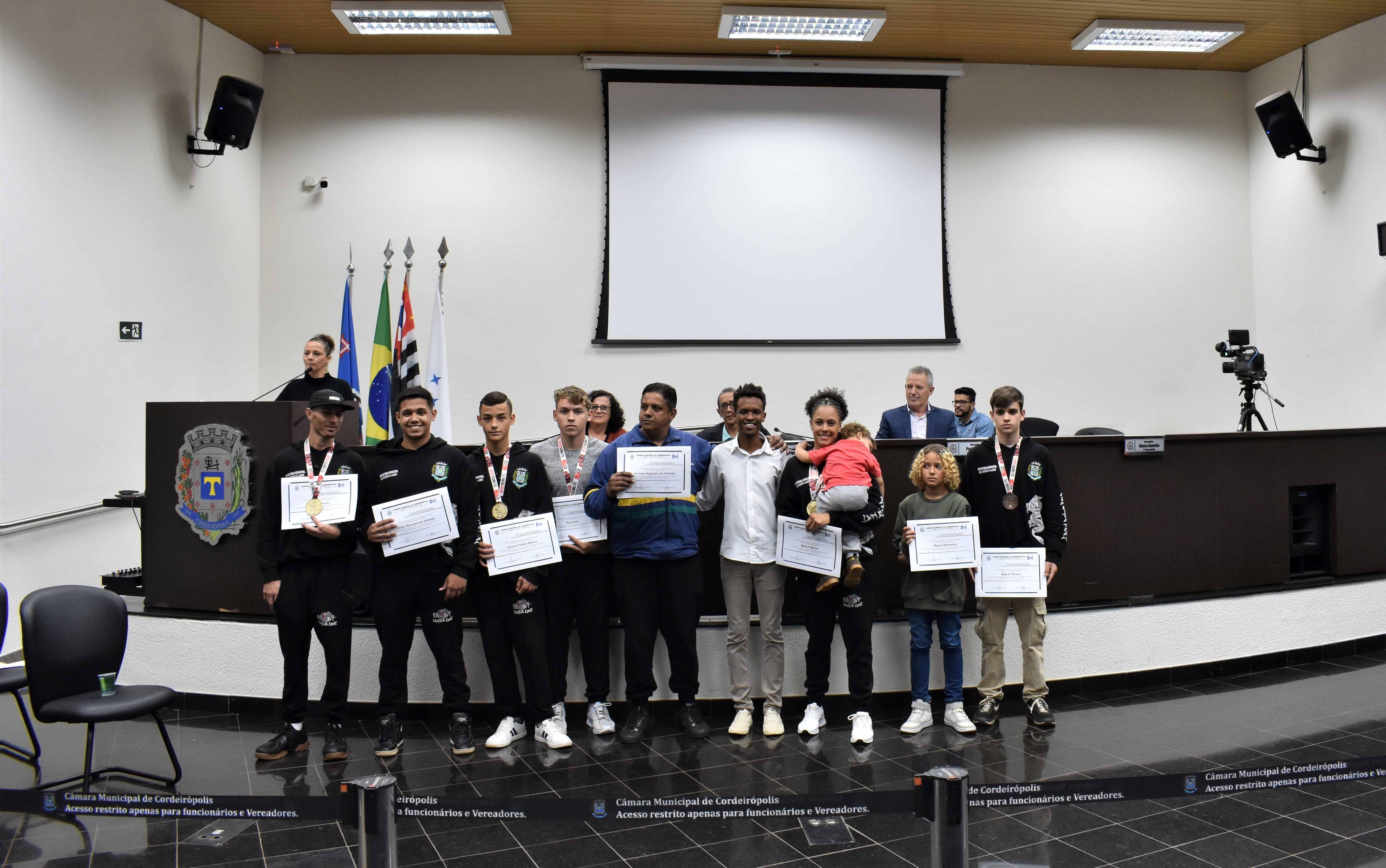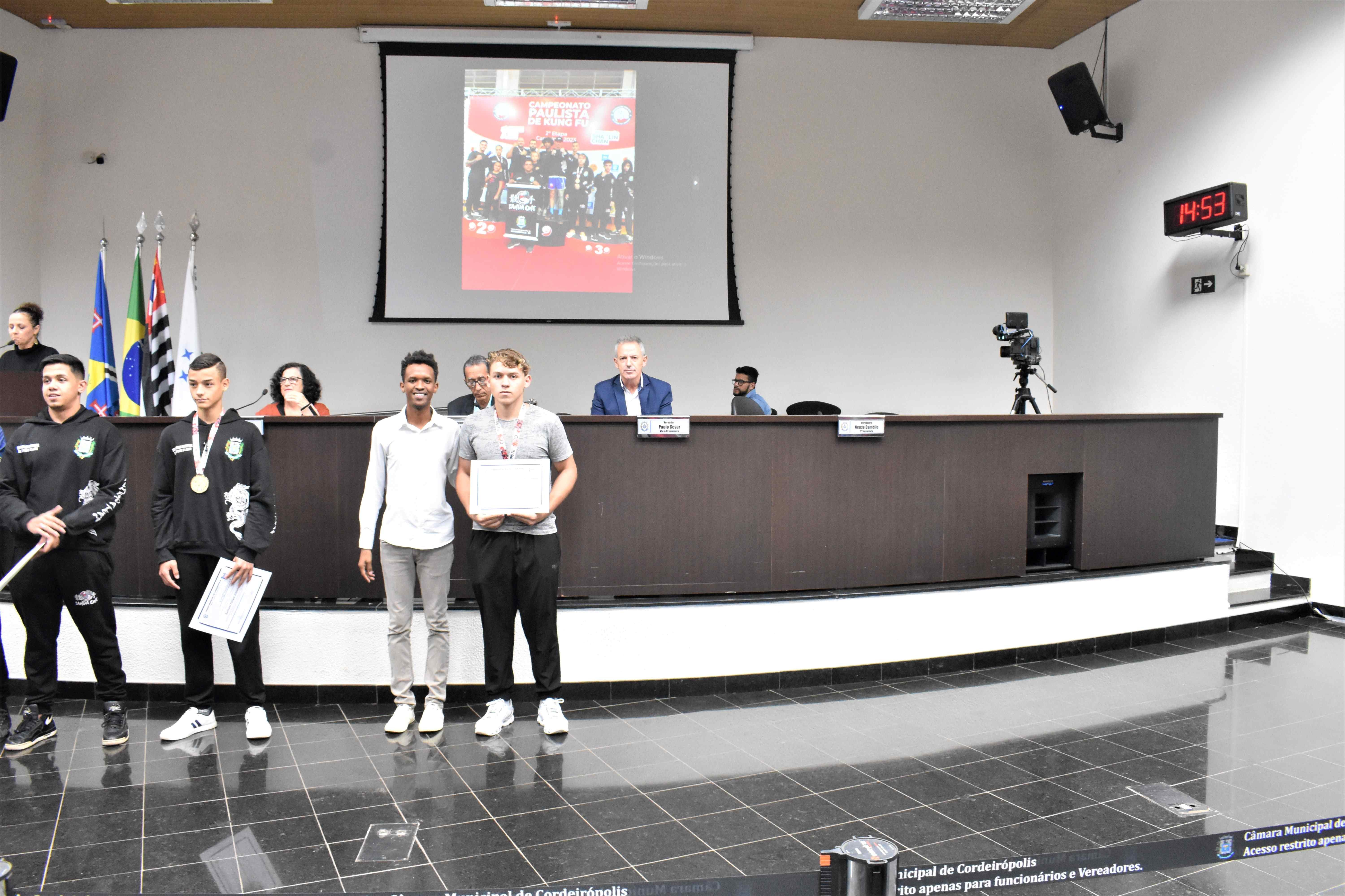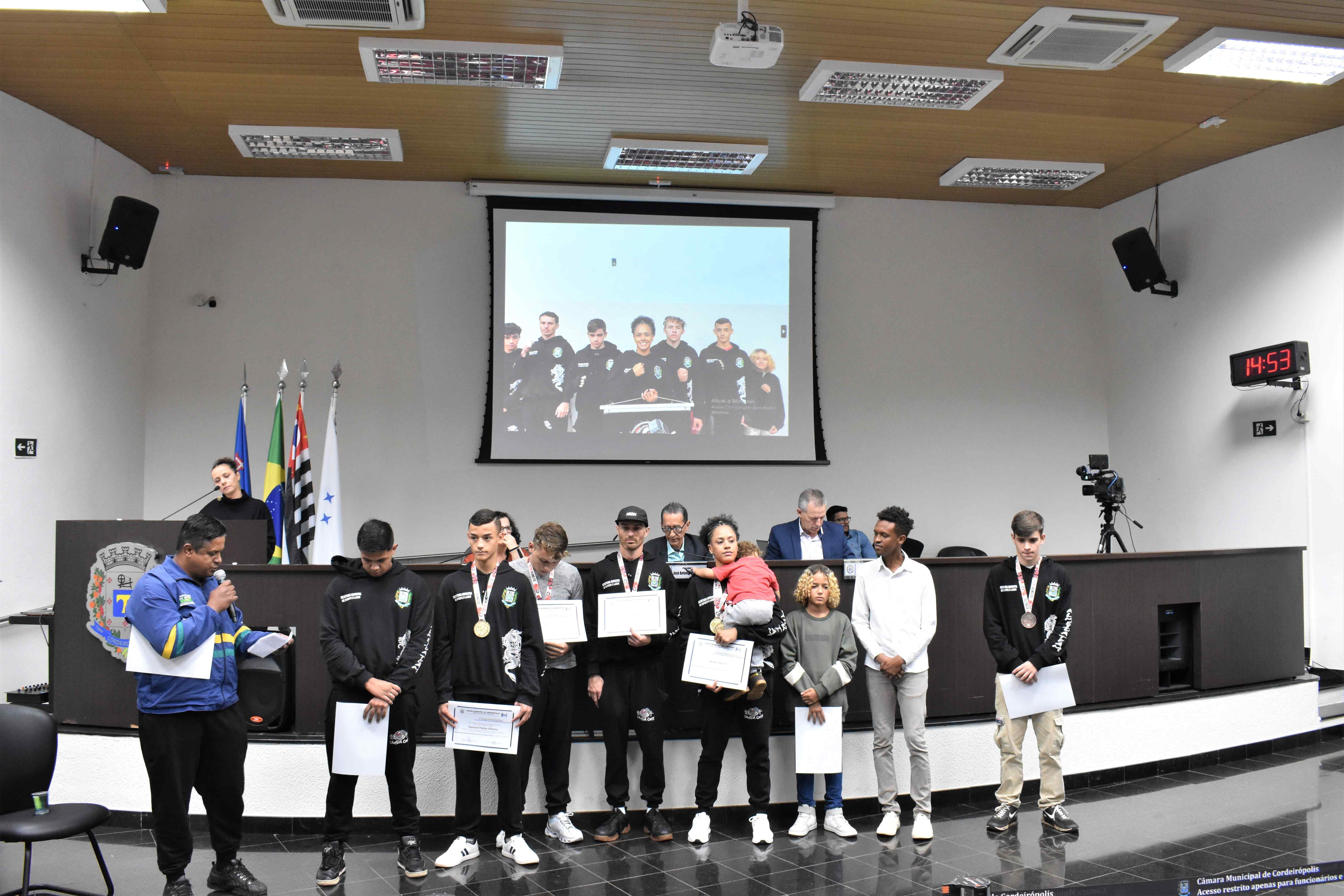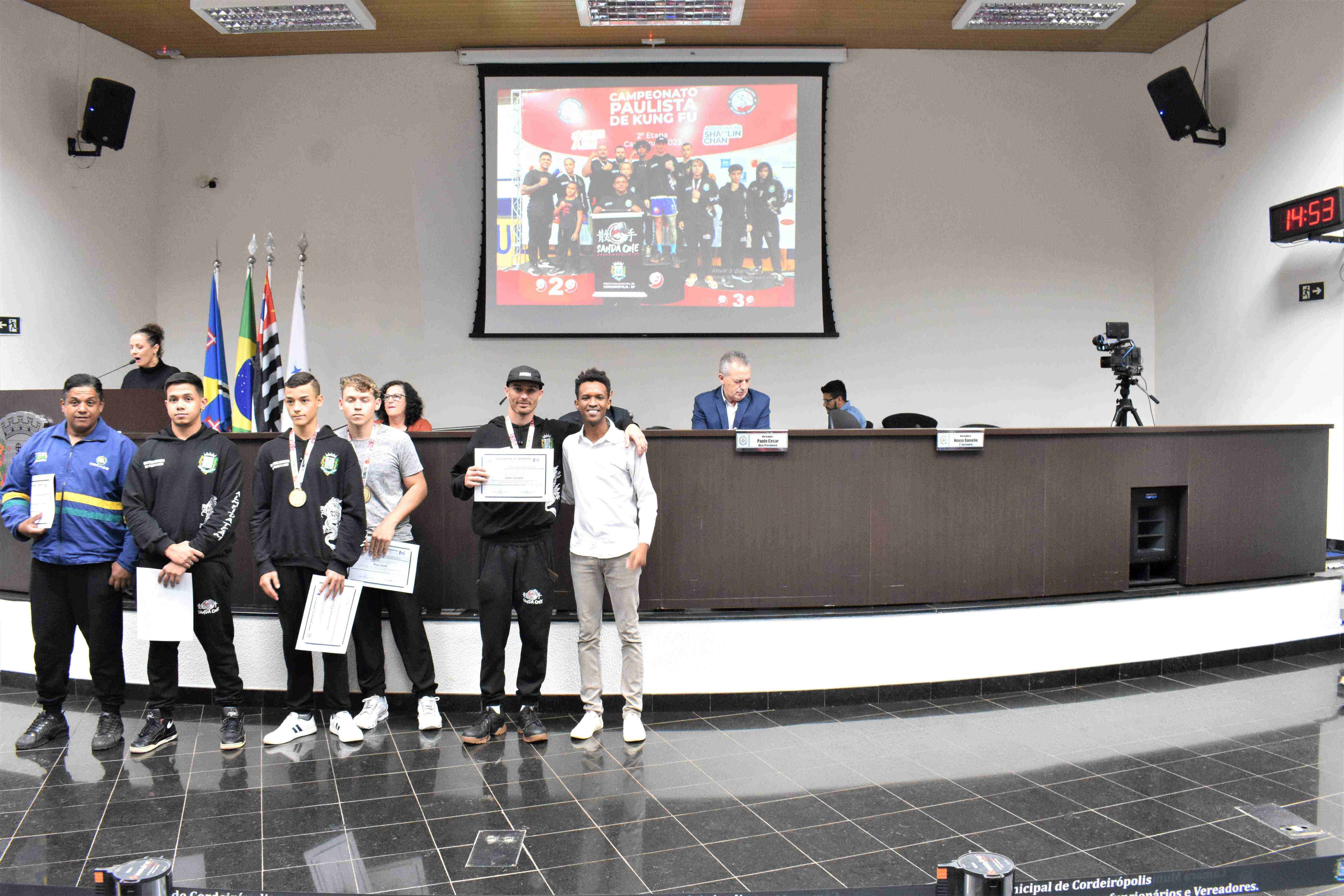 Na última quinta-feira (29) em Sessão Solene na Câmara Municipal, a Equipe Kung Fu Sanda One de Cordeirópolis foi homenageada através da Moção de nº 30/23 de autoria do vereador Diego Fabiano (MDB), a qual propõe voto de congratulações e aplausos.