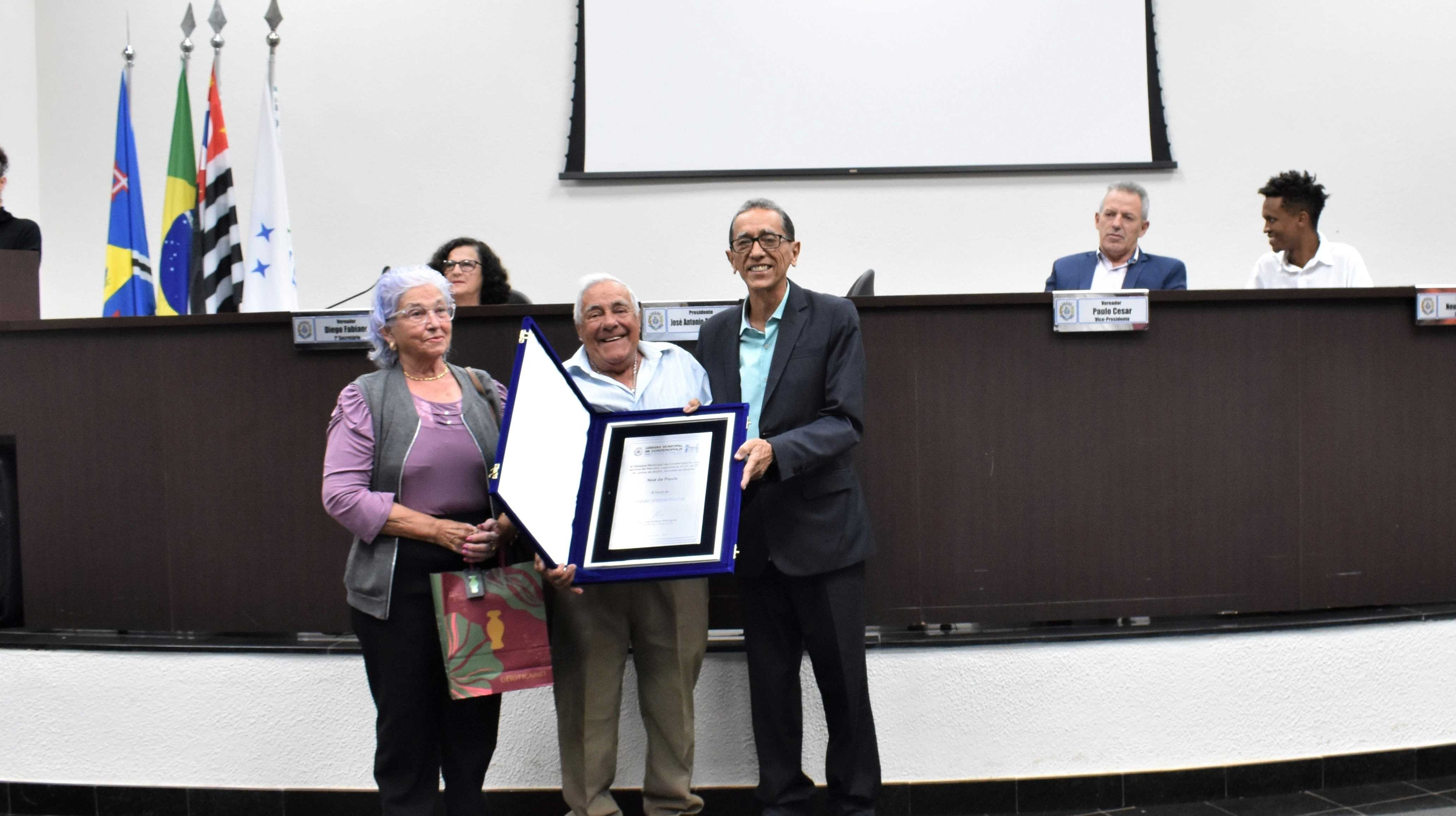 Noé de Paula, o mais recente Cidadão Cordeiropolense, recebeu a mais nobre honraria desta Casa Legislativa, ontem à noite (29) em Sessão Solene, através da Decreto Legislativo de nº 10/23 de autoria do presidente e ver. José Antônio Rodrigues (MDB).