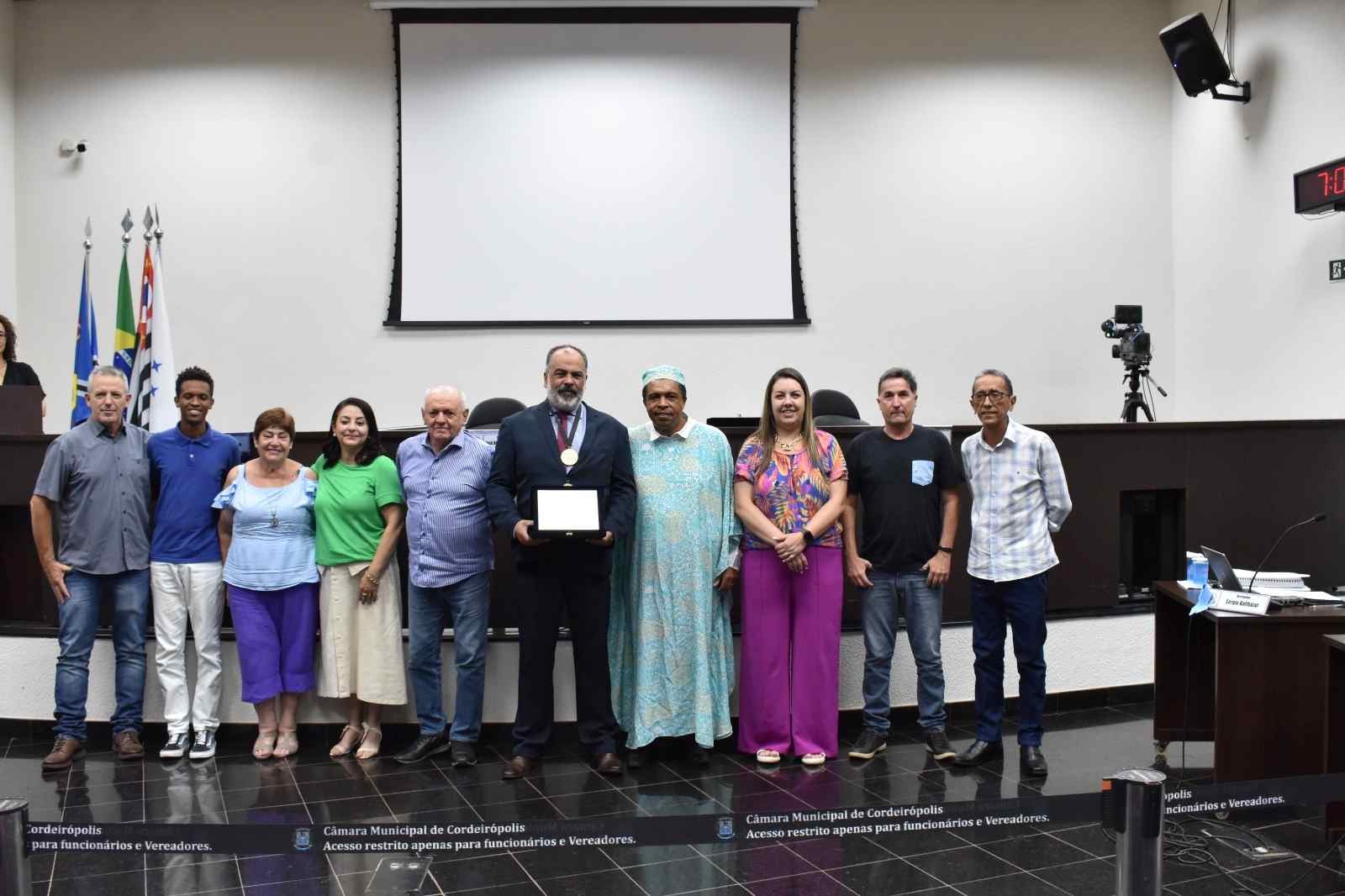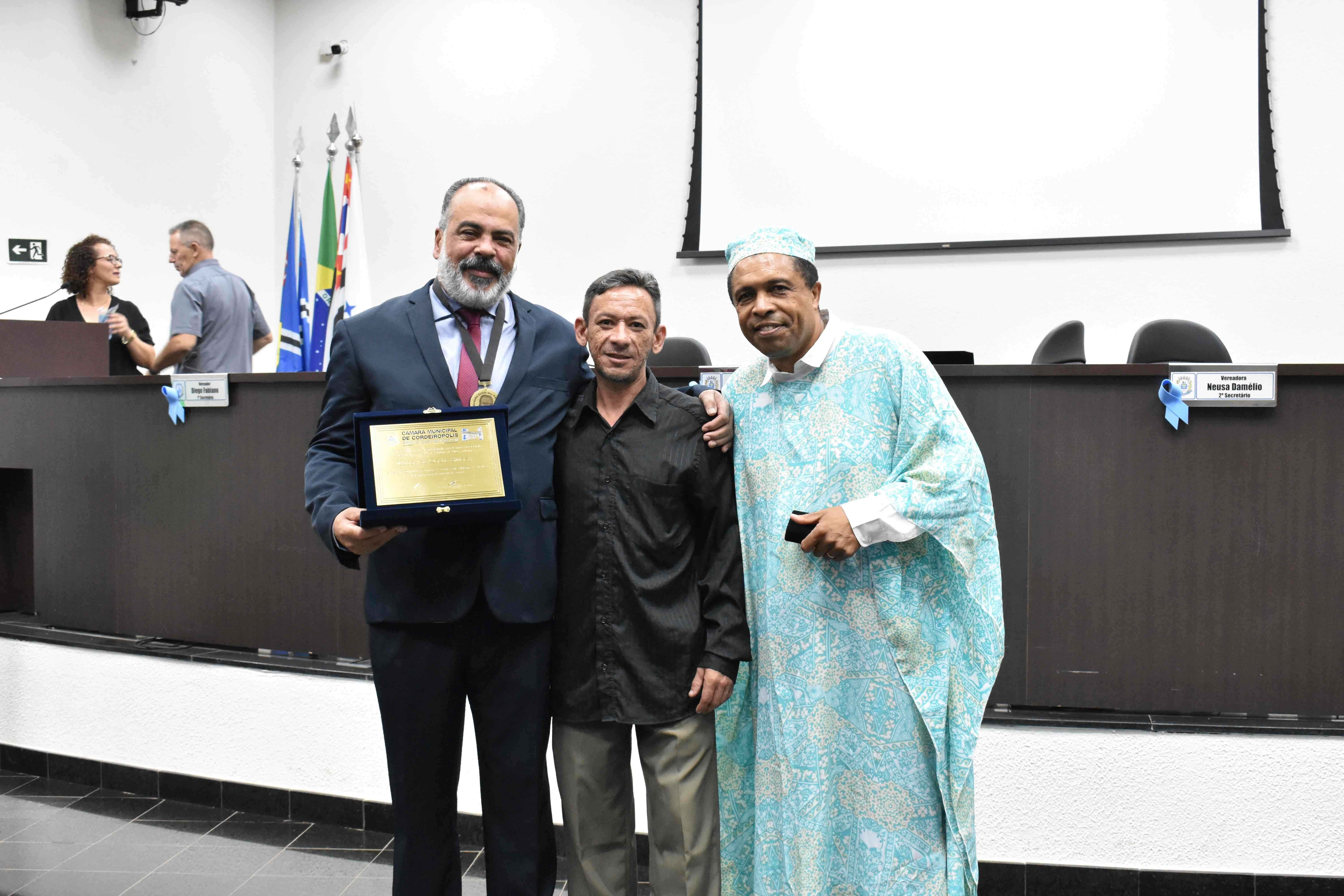 Marcos da Rocha Simões recebeu a medalha “Zumbi dos Palmares” e o diploma de gratidão, pela promoção da igualdade racial. A honraria foi entregue na última terça-feira (21) em sessão ordinária, na Câmara dos Vereadores. Uma homenagem do vereador Sérgio Balthazar Rodrigues de Oliveira, através do Decreto Legislativo nº 15/2023.