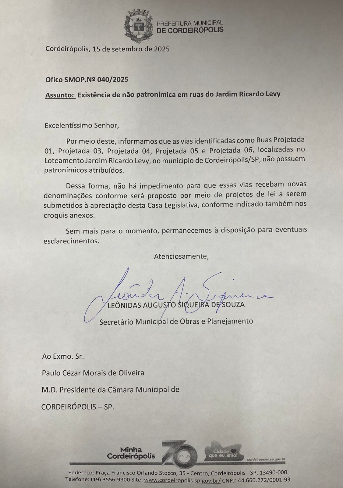Ementa: Denomina “Maria Eneide Souto Levy”, a Rua projetada 04, no Bairro Jardim Ricardo Levy, em Cordeirópolis SP, conforme especifica.