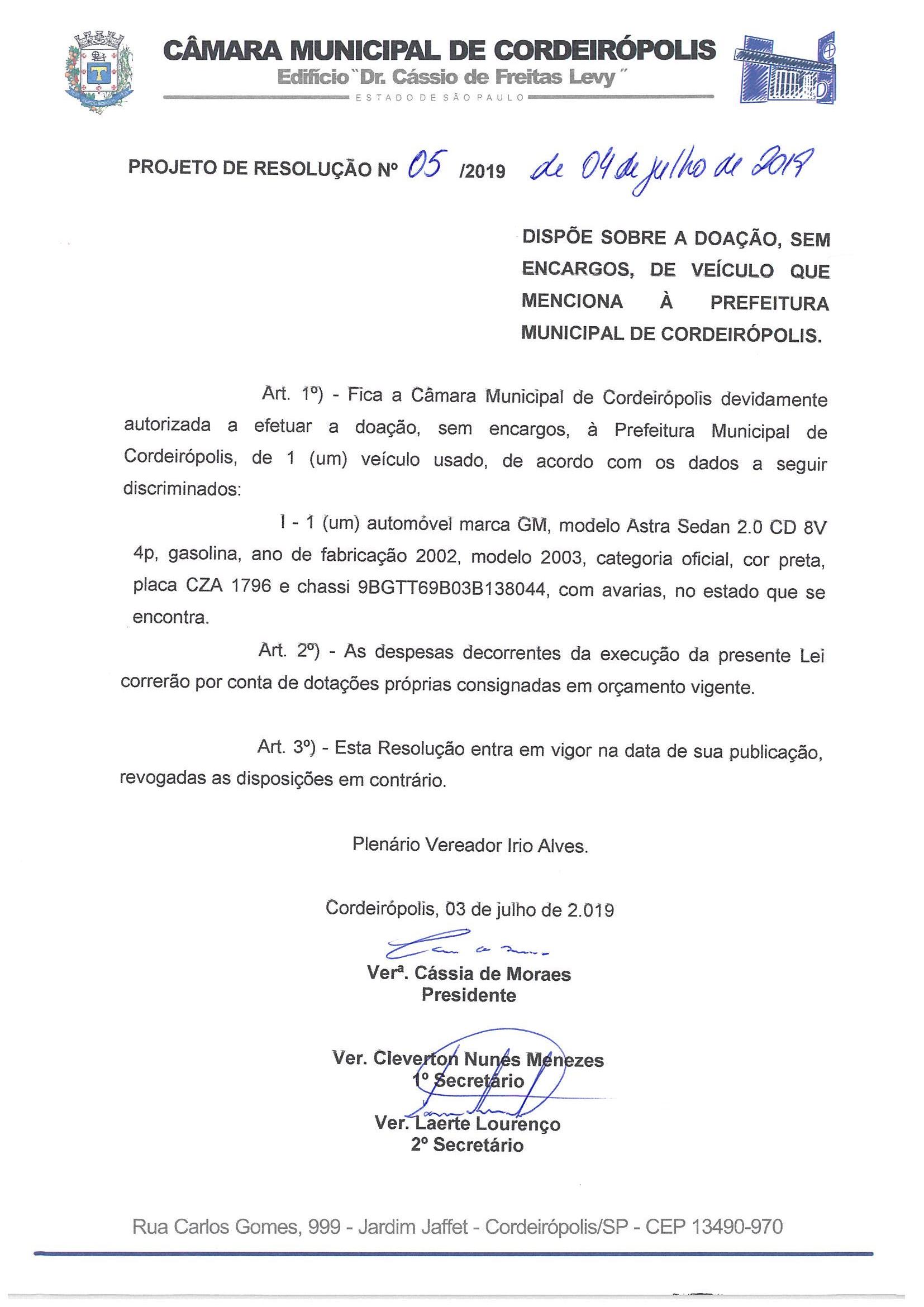 Parecer ao Projeto de Resolução Nº 5/2019 - Dispõe sobre a doação, sem encargos, de veículo que menciona à Prefeitura Municipal de Cordeirópolis. Autor: Diretoria Juridica |